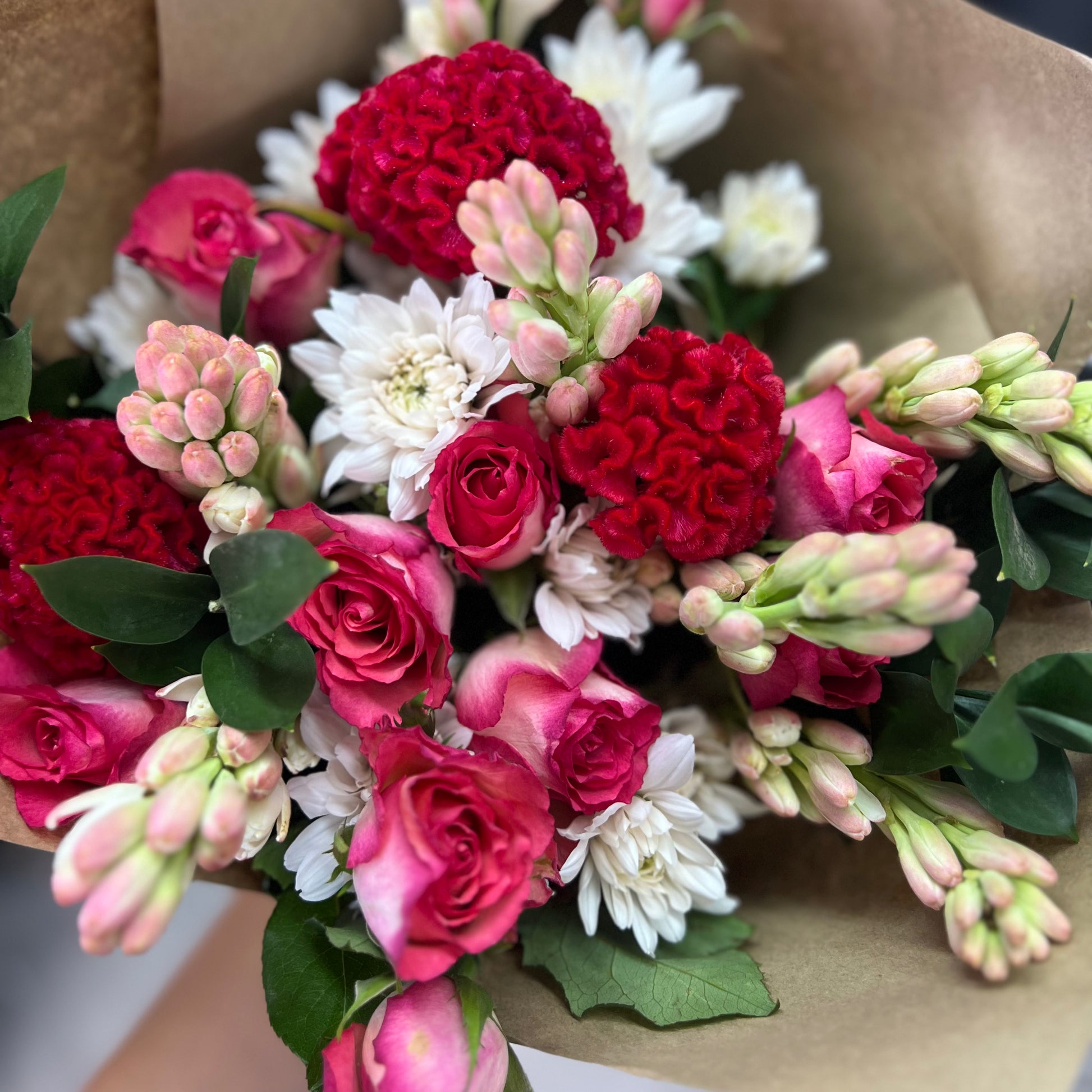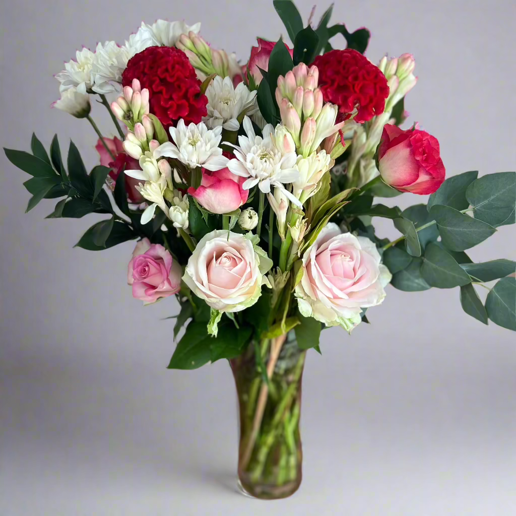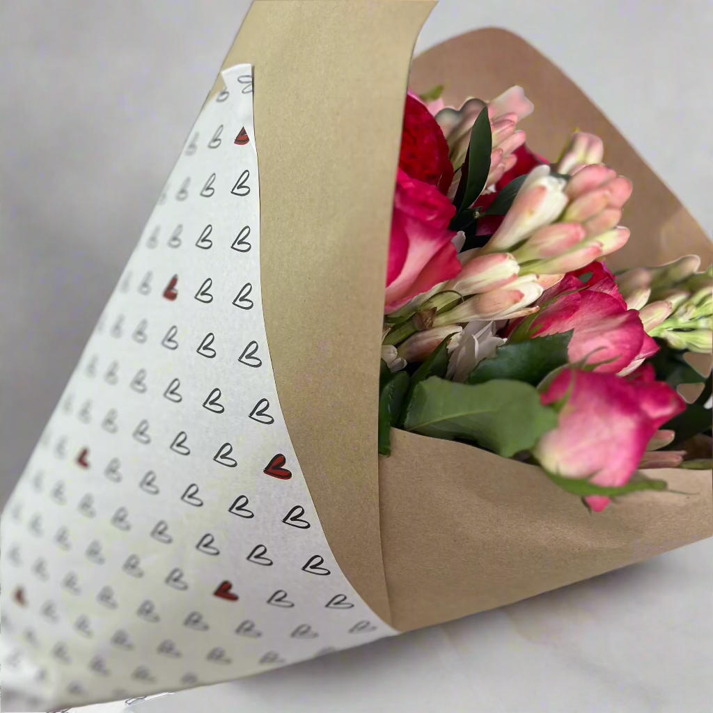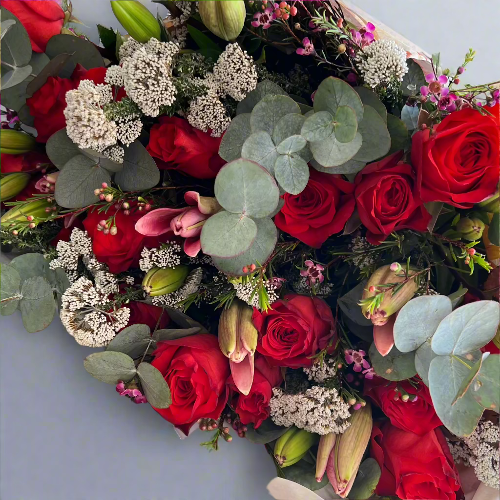 A beautiful soft bouquet of blooms mixed with subtle reds and wrapped up to say I love you! We will make use of the freshest stems in these colour tones to say I LOVE YOU!