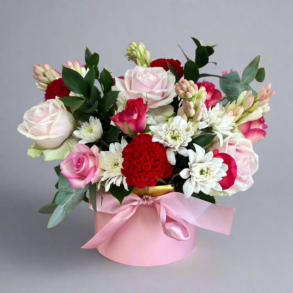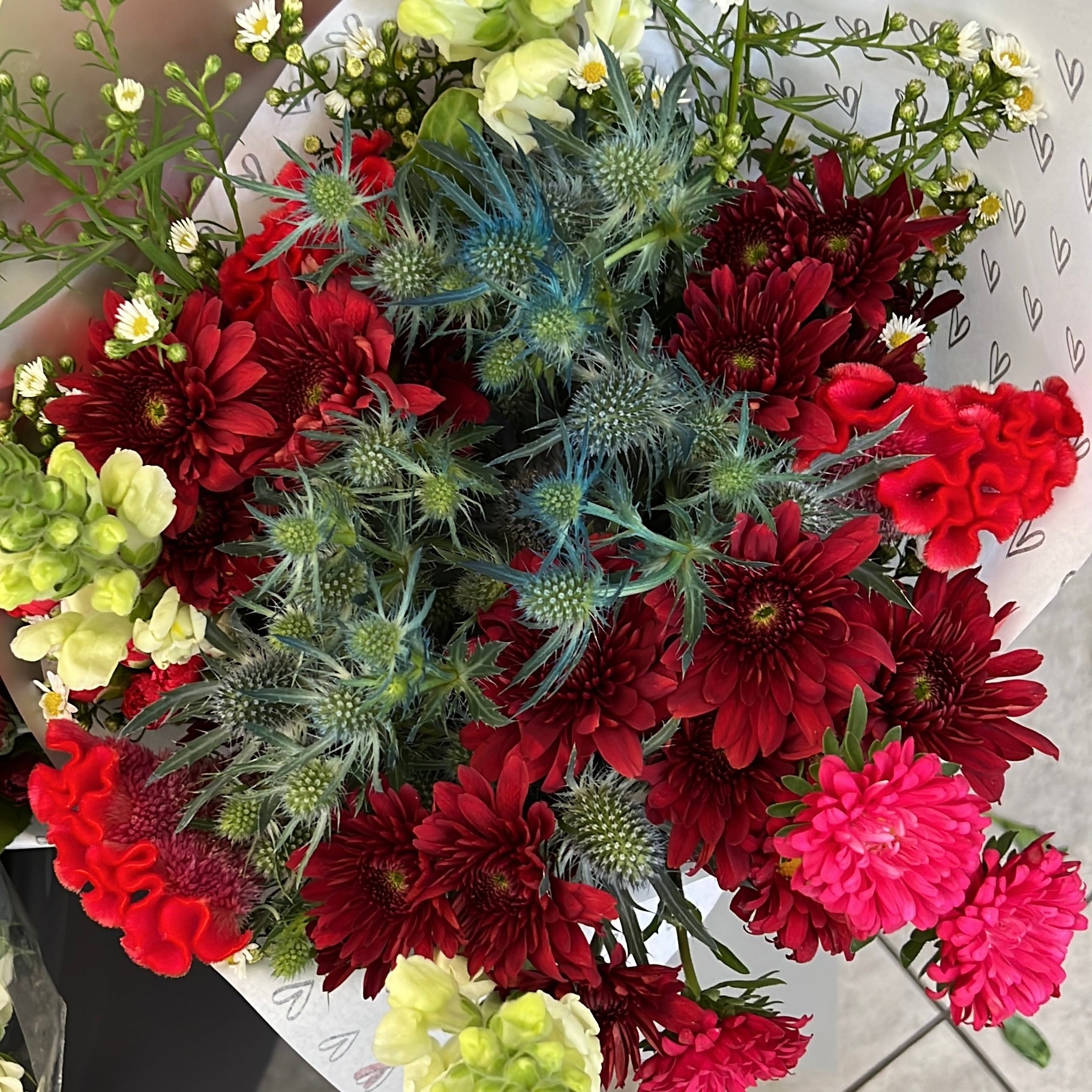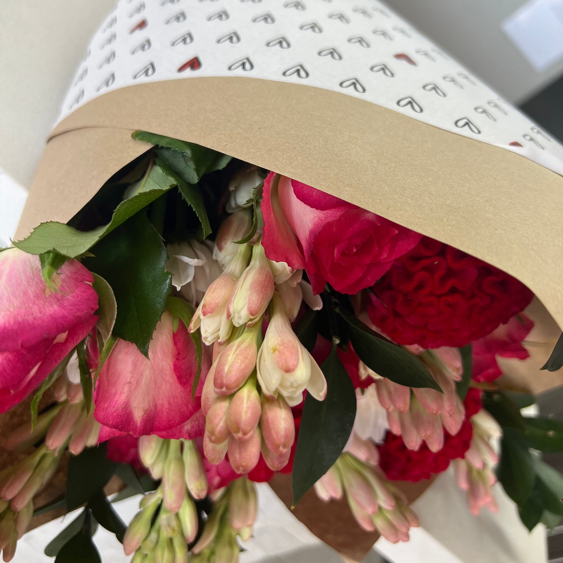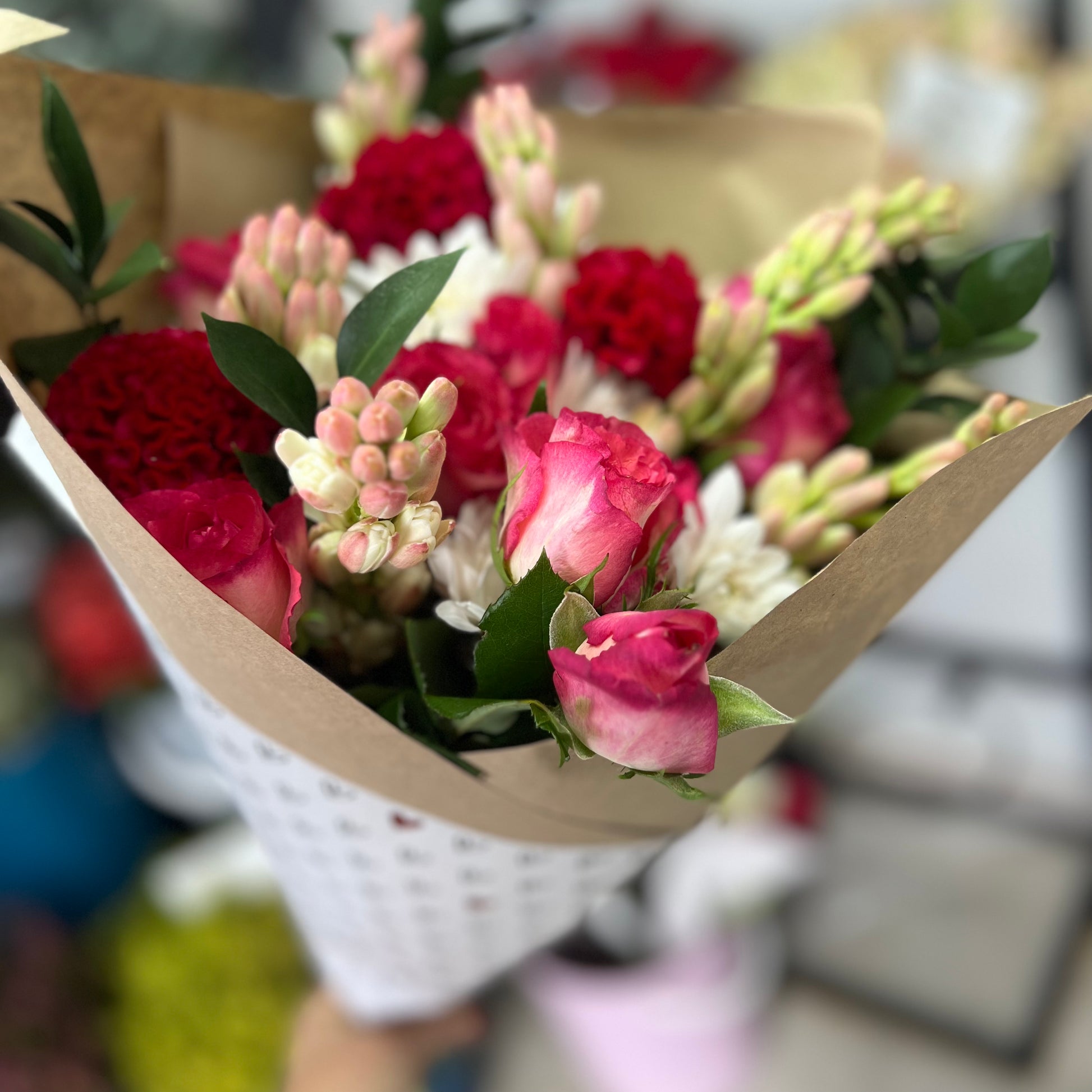 A beautiful soft bouquet of blooms mixed with subtle reds and wrapped up to say I love you! We will make use of the freshest stems in these colour tones to say I LOVE YOU!