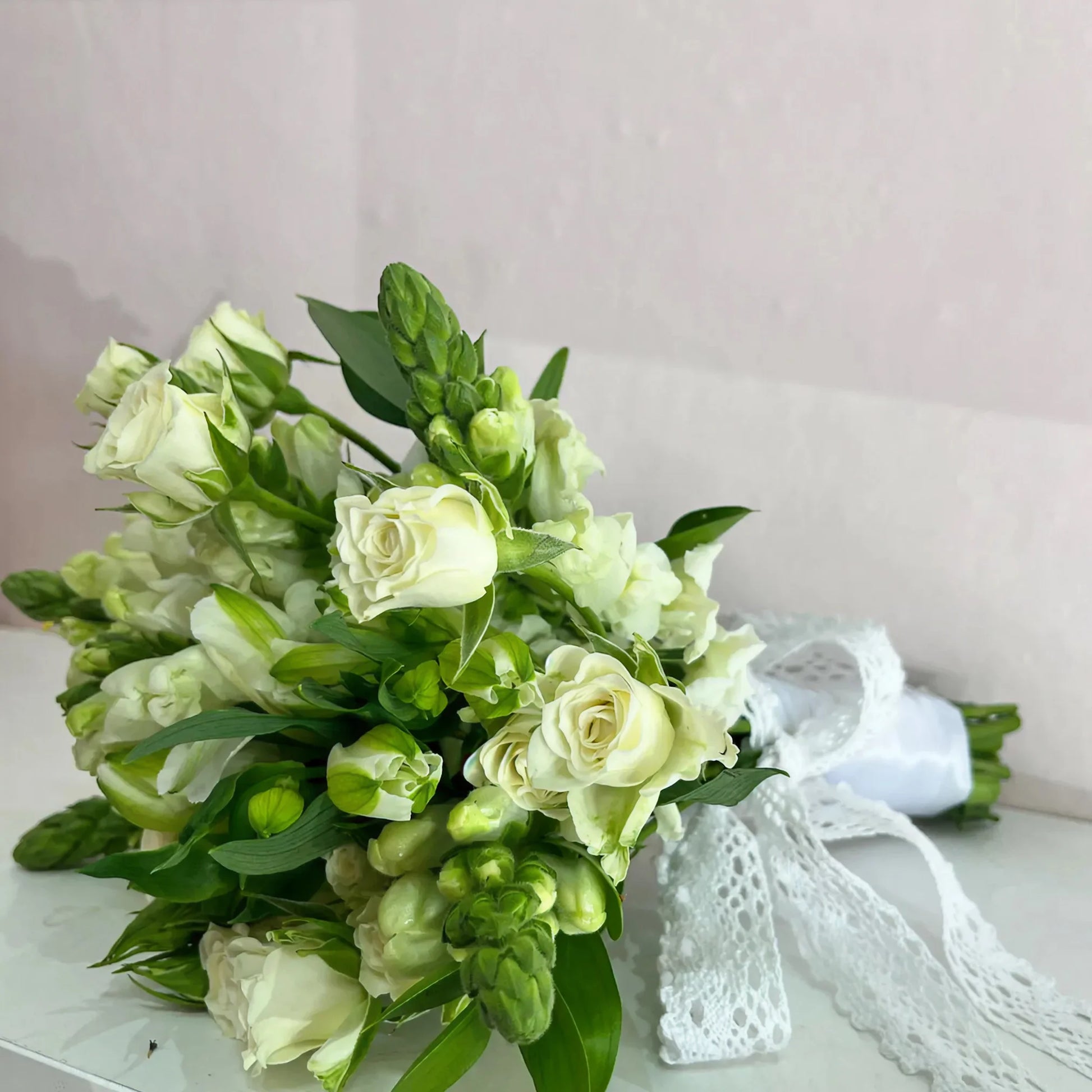 This bouquet is soft, fresh, and beautifully understated. Creamy white roses sit gently between crisp white blooms and layers of clean green foliage, giving it that calm, airy look that feels effortless and elegant. Finished with a delicate white lace ribbon, it’s the kind of bouquet that suits meaningful moments, whether it’s a wedding day, a heartfelt thank-you, or simply a gift that says “I’m here” without needing big words.